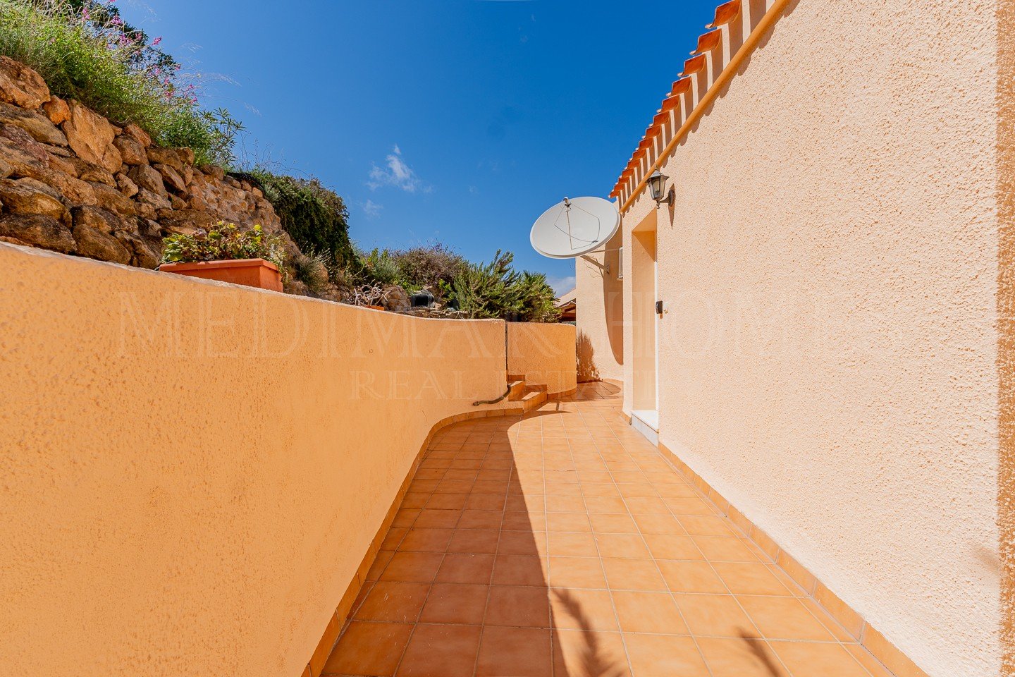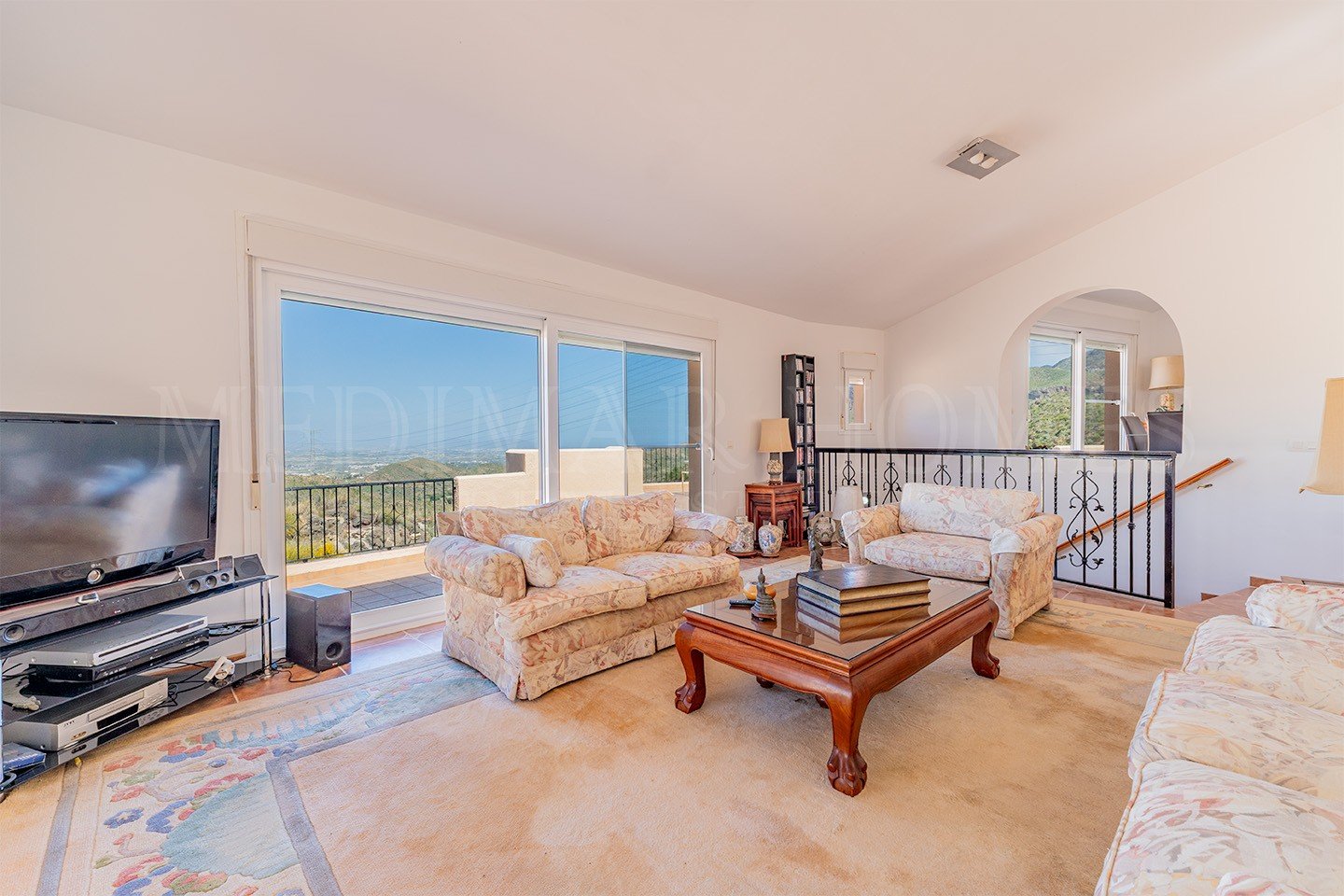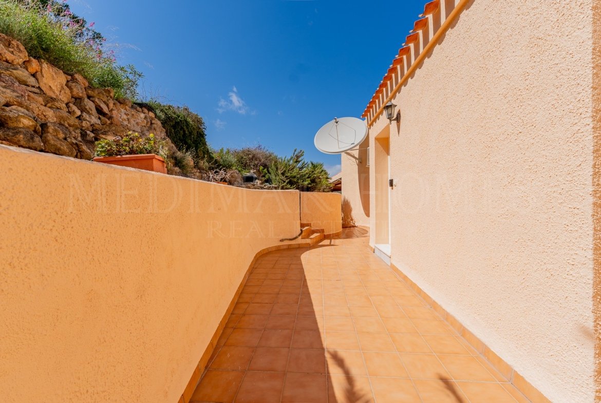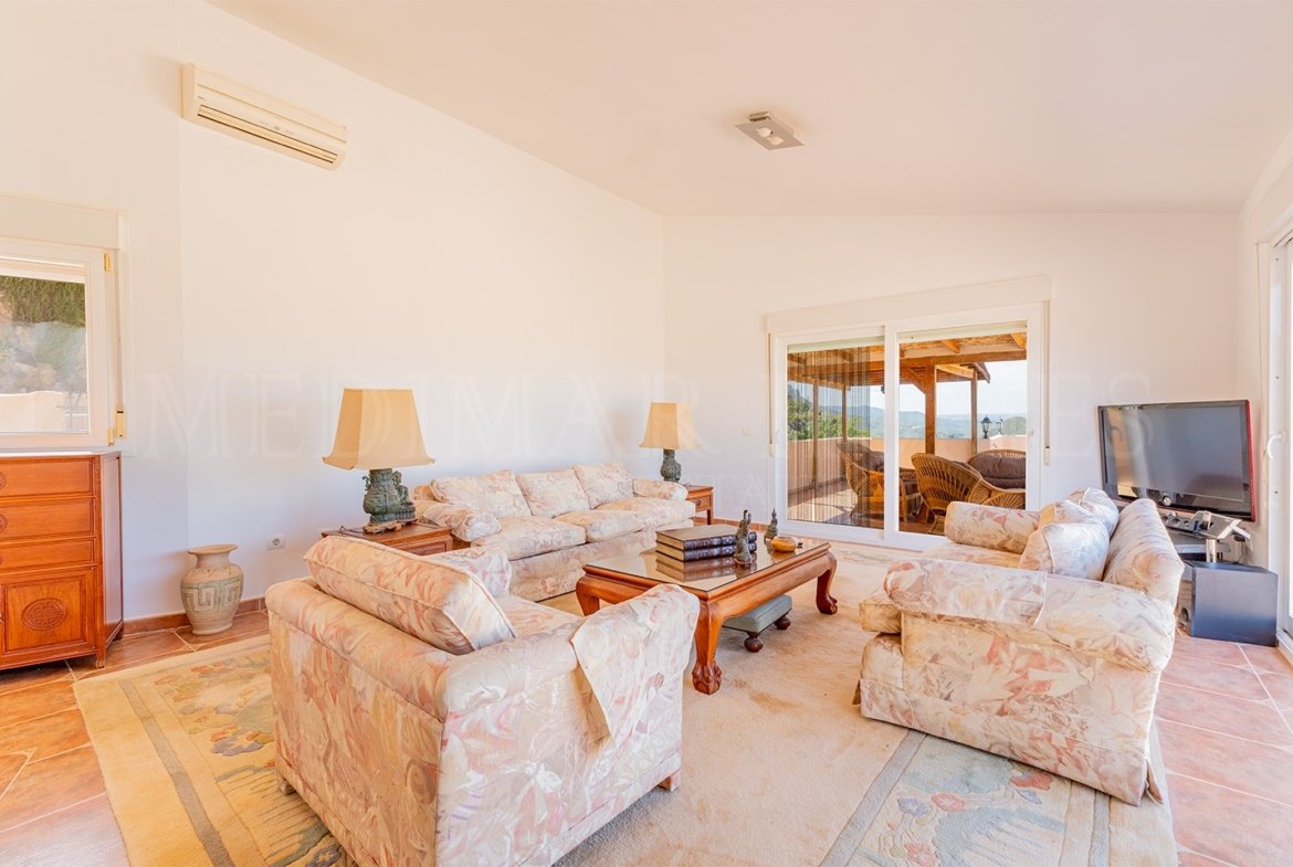 A la izquierda del recibidor, la espaciosa sala de estar cuenta con puertas esquineras que también dan a la terraza. Este hermoso espacio exterior incluye una zona a la sombra, perfecto para comer al aire libre, además de amplias zonas para tomar el sol, todo ello mientras se disfruta de vistas panorámicas de las montañas circundantes y el mar a lo lejos.