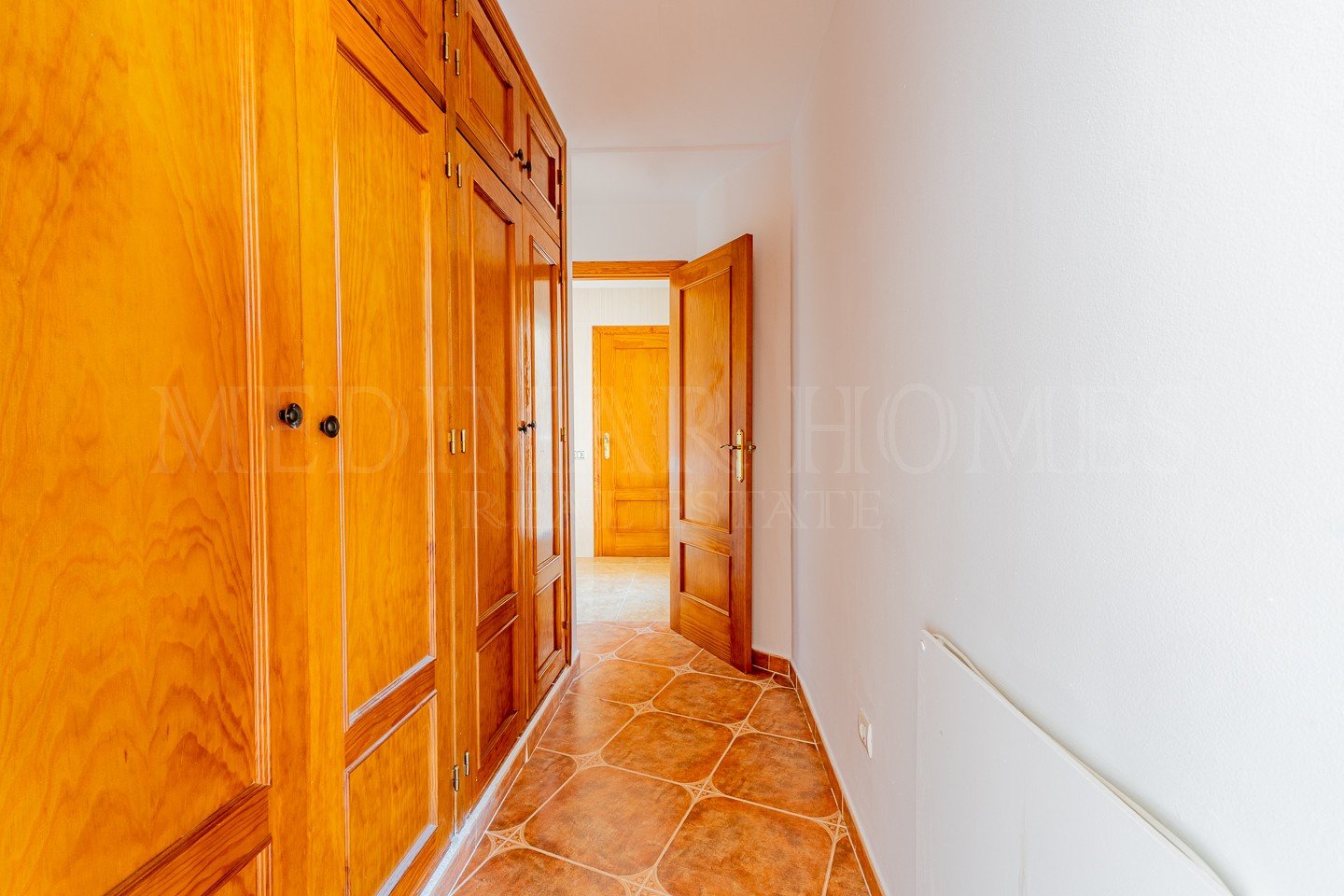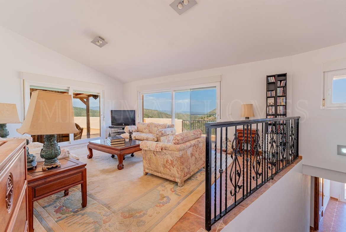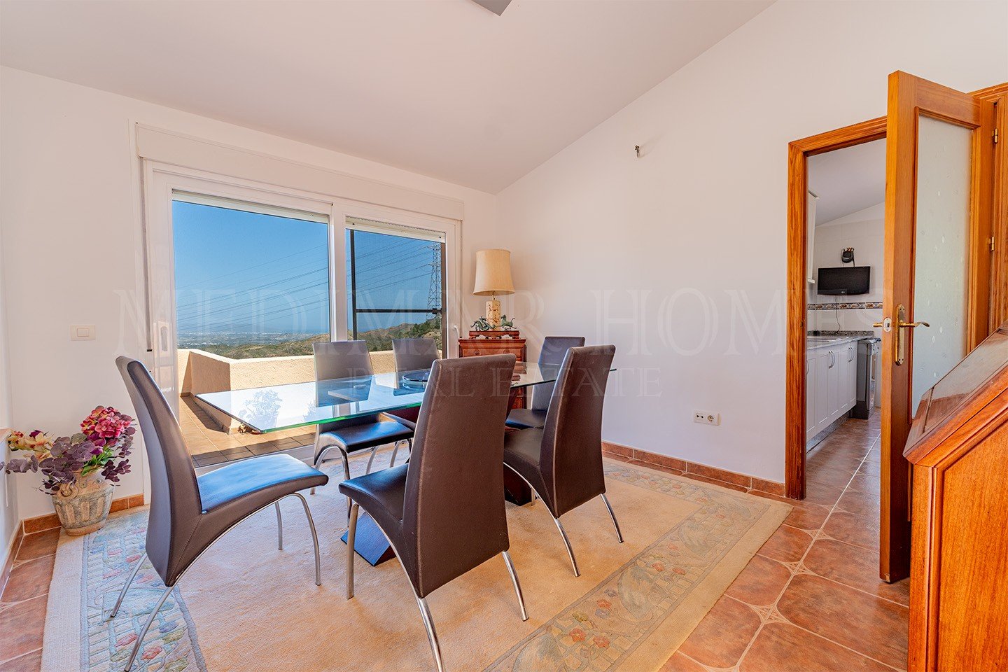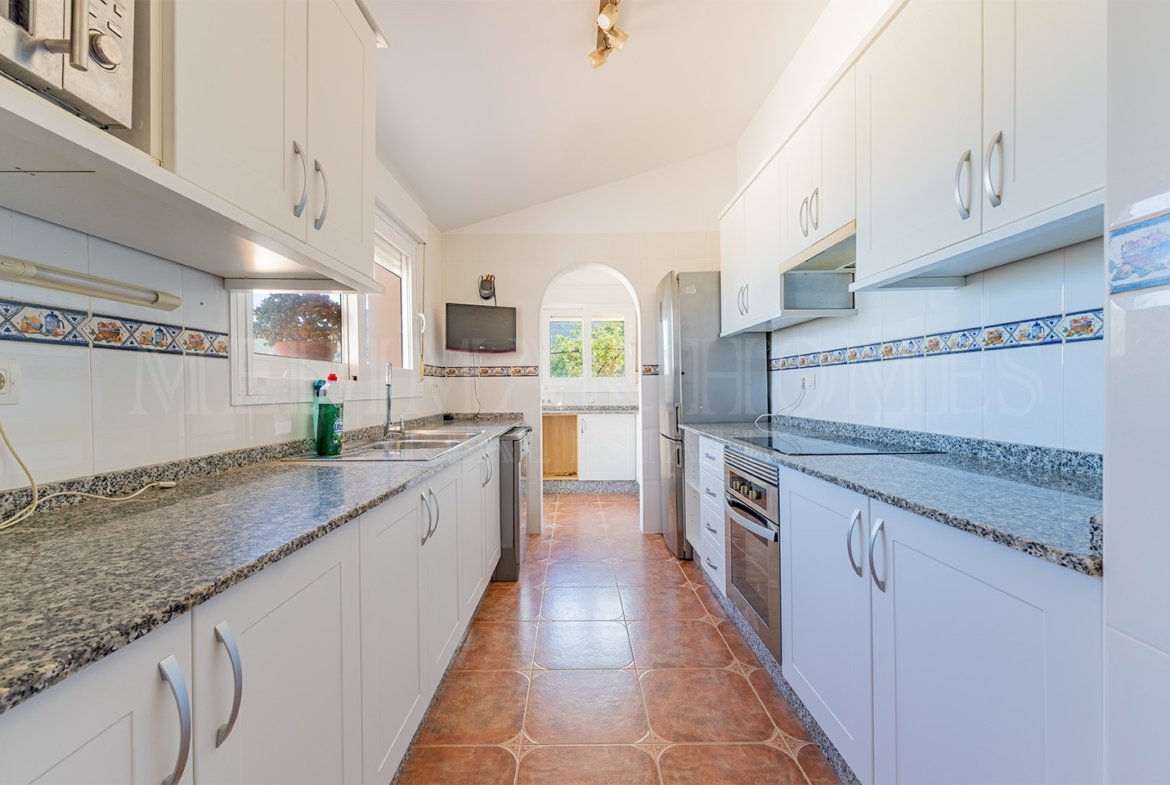 A la izquierda del recibidor, la espaciosa sala de estar cuenta con puertas esquineras que también dan a la terraza. Este hermoso espacio exterior incluye una zona a la sombra, perfecto para comer al aire libre, además de amplias zonas para tomar el sol, todo ello mientras se disfruta de vistas panorámicas de las montañas circundantes y el mar a lo lejos.