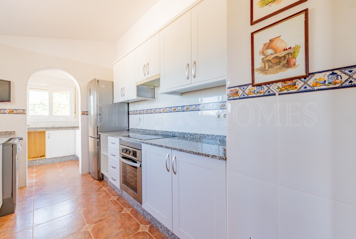 Al entrar, le da la bienvenida un luminoso recibidor con un práctico aseo a la derecha. El recibidor se abre a un espacioso comedor con espacio para una mesa de seis plazas. Las puertas dobles del comedor dan a una amplia terraza que rodea toda la fachada de la villa. A la derecha, encontrará una cocina totalmente equipada con encimeras de granito y electrodomésticos, y un lavadero o despensa contiguo con acceso directo a la misma terraza. Desde aquí, unas escaleras conducen al garaje.
