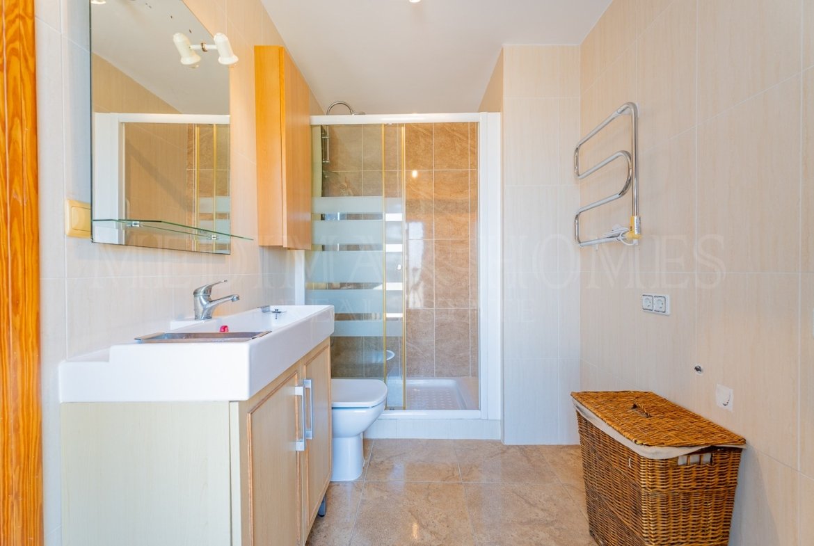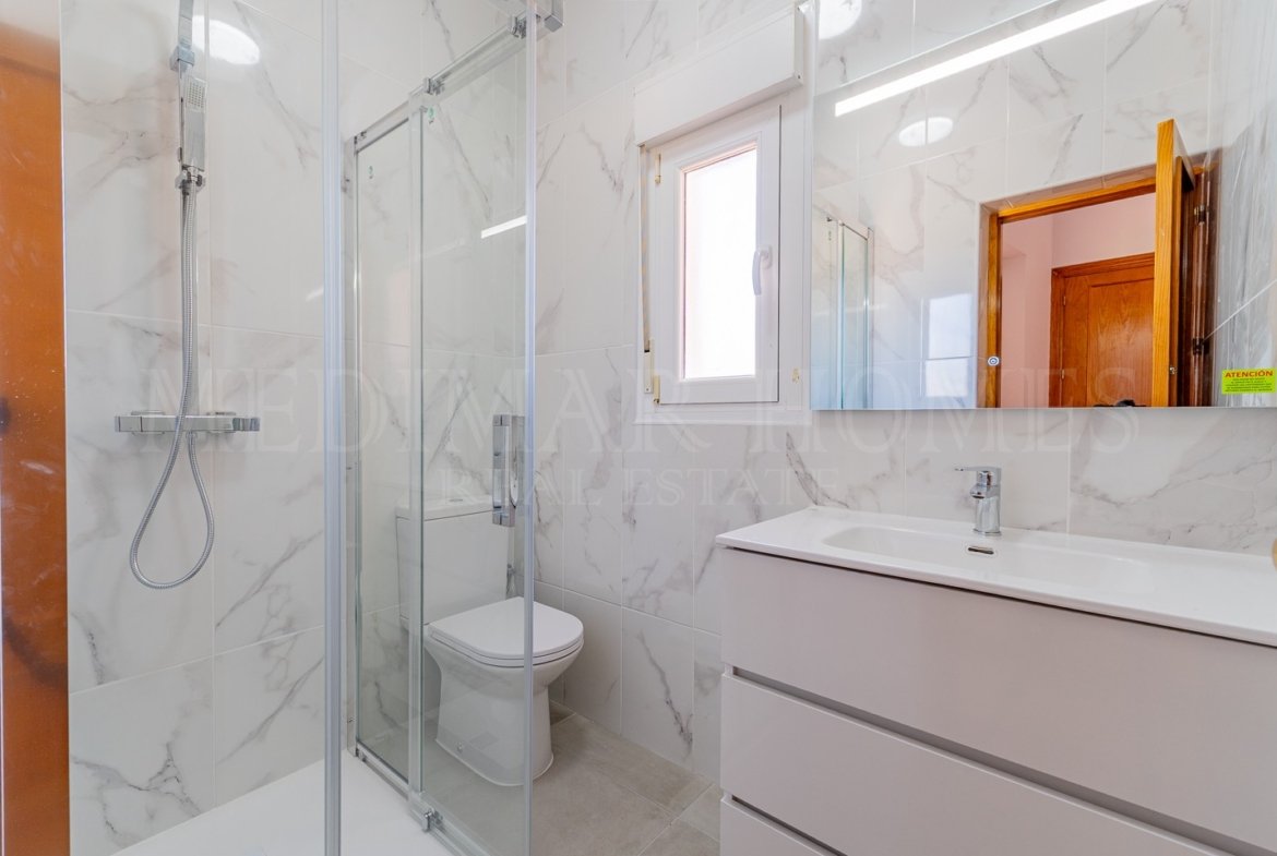 Una escalera desde el salón conduce a los dormitorios de la planta baja. Inmediatamente a la derecha se encuentra el tercer dormitorio doble, con armarios empotrados y puertas que dan a las terrazas de la planta baja. A continuación se encuentra el segundo dormitorio doble, también con armarios empotrados y acceso exterior. Junto a él se encuentra el baño principal con cabina de ducha, mientras que enfrente hay un práctico armario.