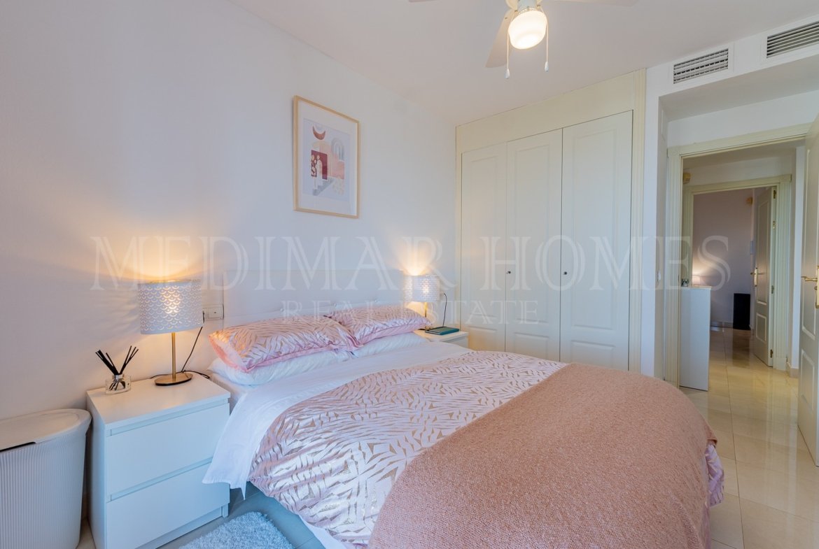 De vuelta al interior, un pasillo independiente de la sala de estar nos lleva a los dormitorios. A la derecha encontramos el segundo dormitorio doble con armarios empotrados. A continuación, el baño principal, con lavabo de mármol y mampara de ducha de cristal. Finalmente, el dormitorio principal se ubica a la izquierda, también con armarios empotrados y acceso directo a la terraza cubierta a través de puertas correderas de cristal.
