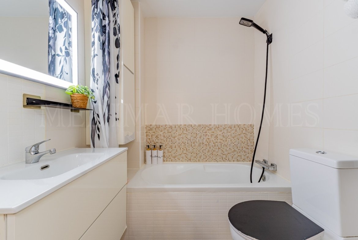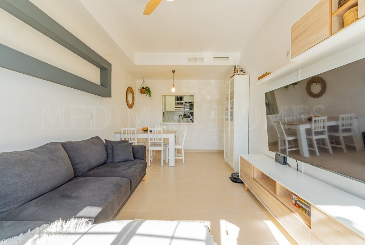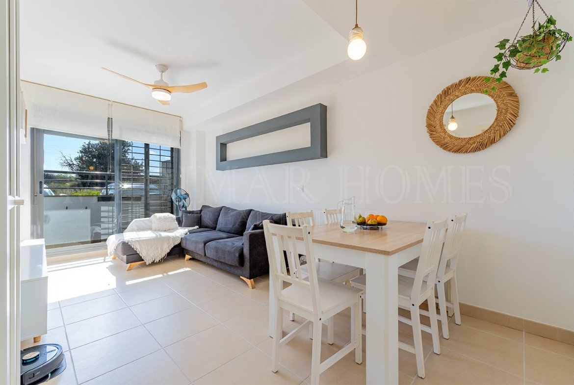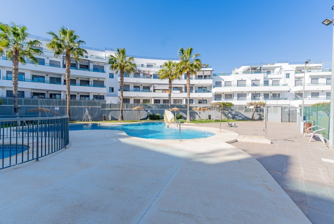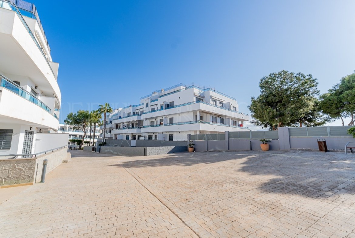 This well-presented 2-bedroom, 1-bathroom ground floor apartment is ideally located just 200 metres from the beach, offering excellent access to the coast while being within easy walking distance of shops, supermarkets, restaurants, and all daily amenities. The property forms part of a well-established and beautifully maintained residential community, known for its peaceful atmosphere and attractive surroundings.