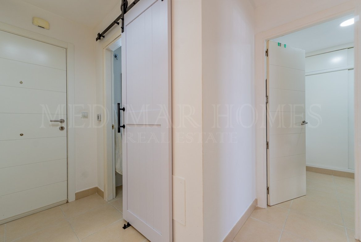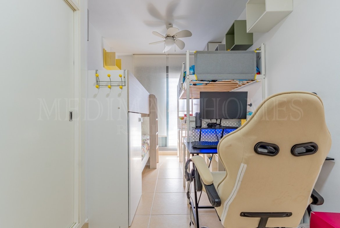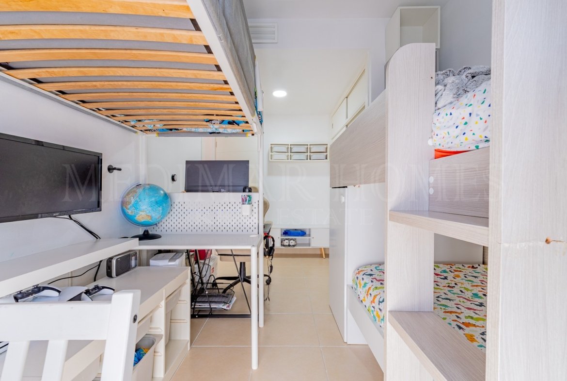 From the living area, the hallway continues to the sleeping accommodation. The second double bedroom is to our immediate right and supports a double bed or twin singles as well as free standing wardrobes. The hallway then finishes with the master bedroom boasting fitted wardrobes and direct access to the apartments terrace. Note that this bedroom currently has 2 sets of bunkbeds but a kingsize bed would easily fit here.