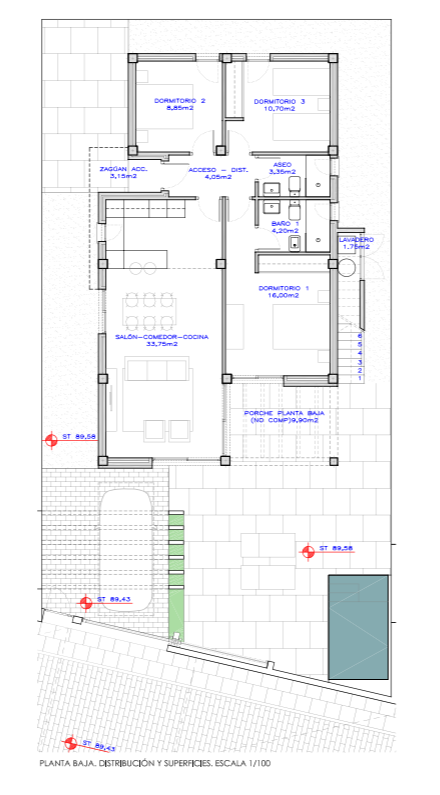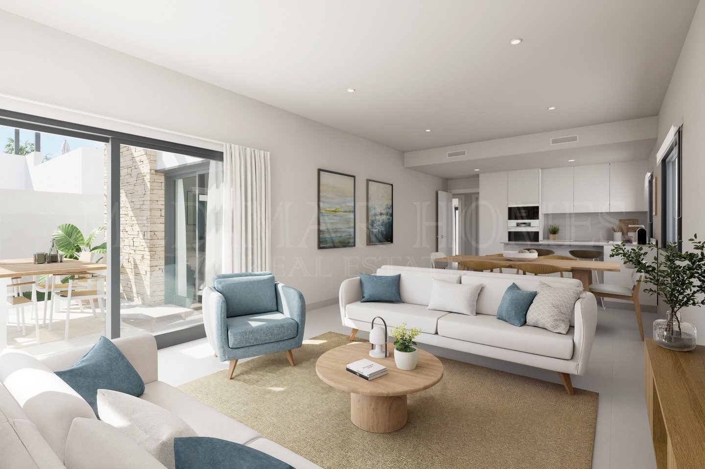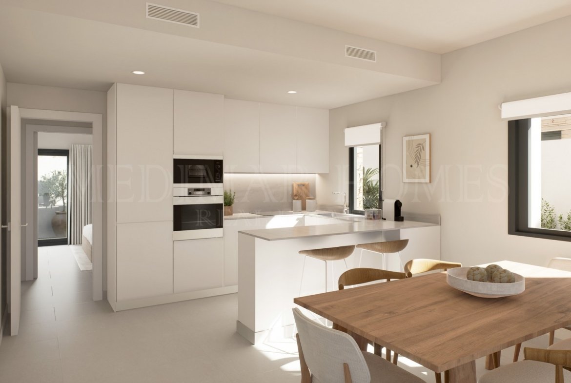 Entering the property, a central hallway clearly separates the living and sleeping areas. The open-plan living and dining space is bright and well proportioned, with large openings that lead directly out to a covered porch and terrace — ideal for outdoor dining or relaxing by the pool. The kitchen is fully fitted and equipped with integrated appliances, offering a clean, modern design with plenty of workspace for everyday living.