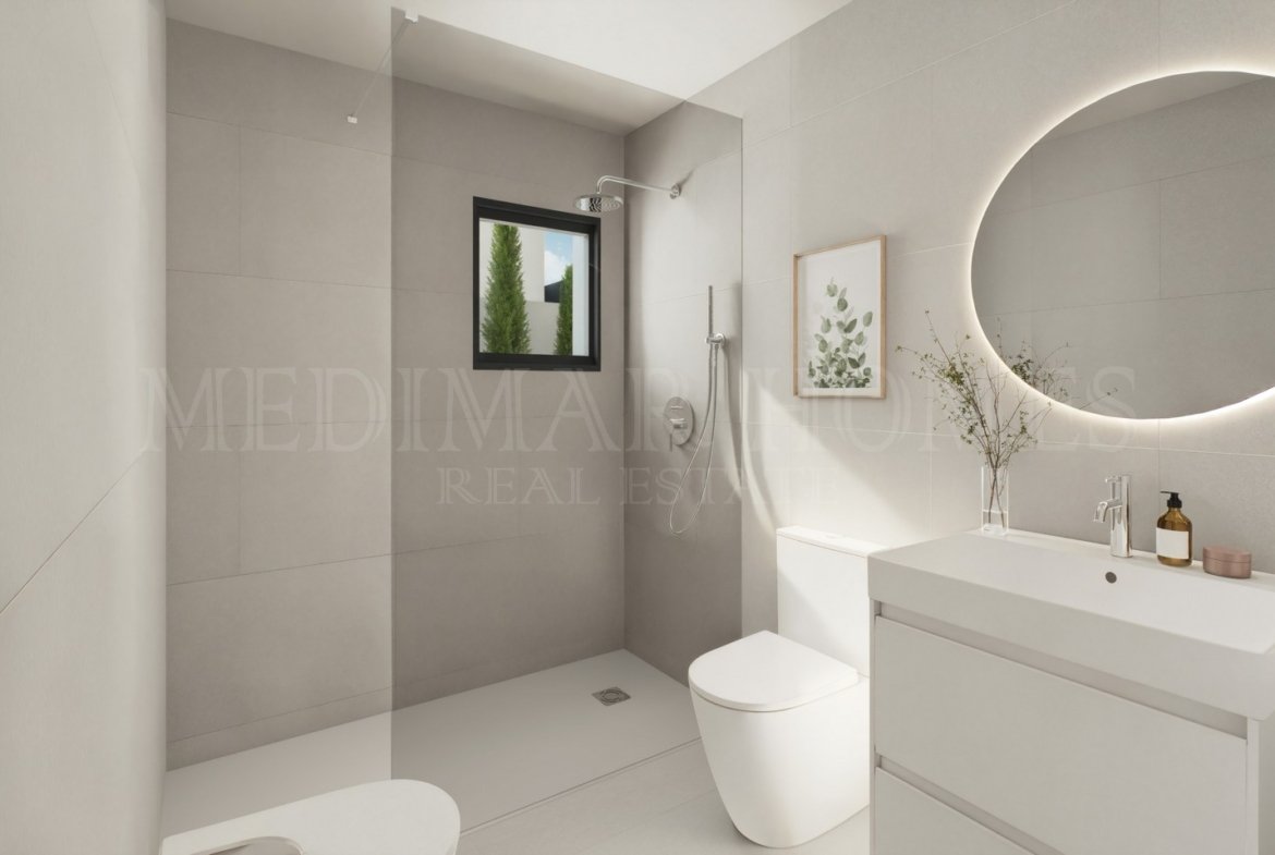 The villas offer three comfortable bedrooms, all with built-in wardrobes and direct access to the garden. The main bedroom benefits from its own en-suite bathroom and opens out towards the terrace and pool area, creating a calm and private retreat. A second full bathroom serves the remaining bedrooms.