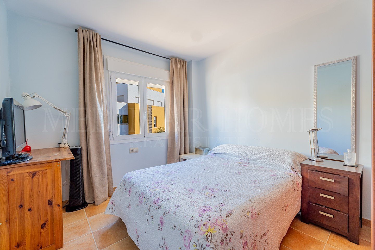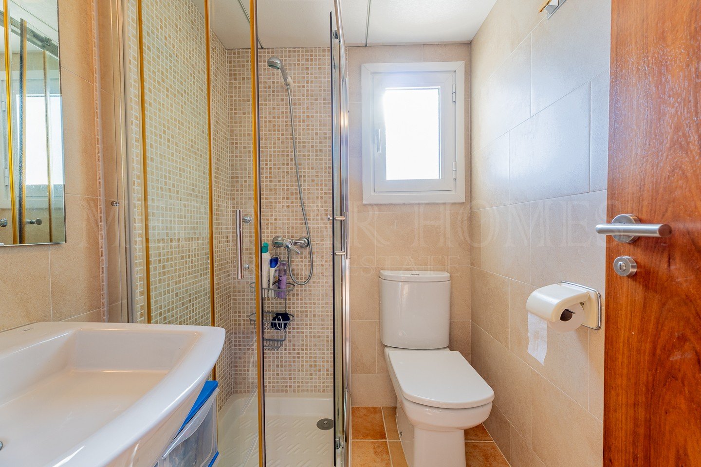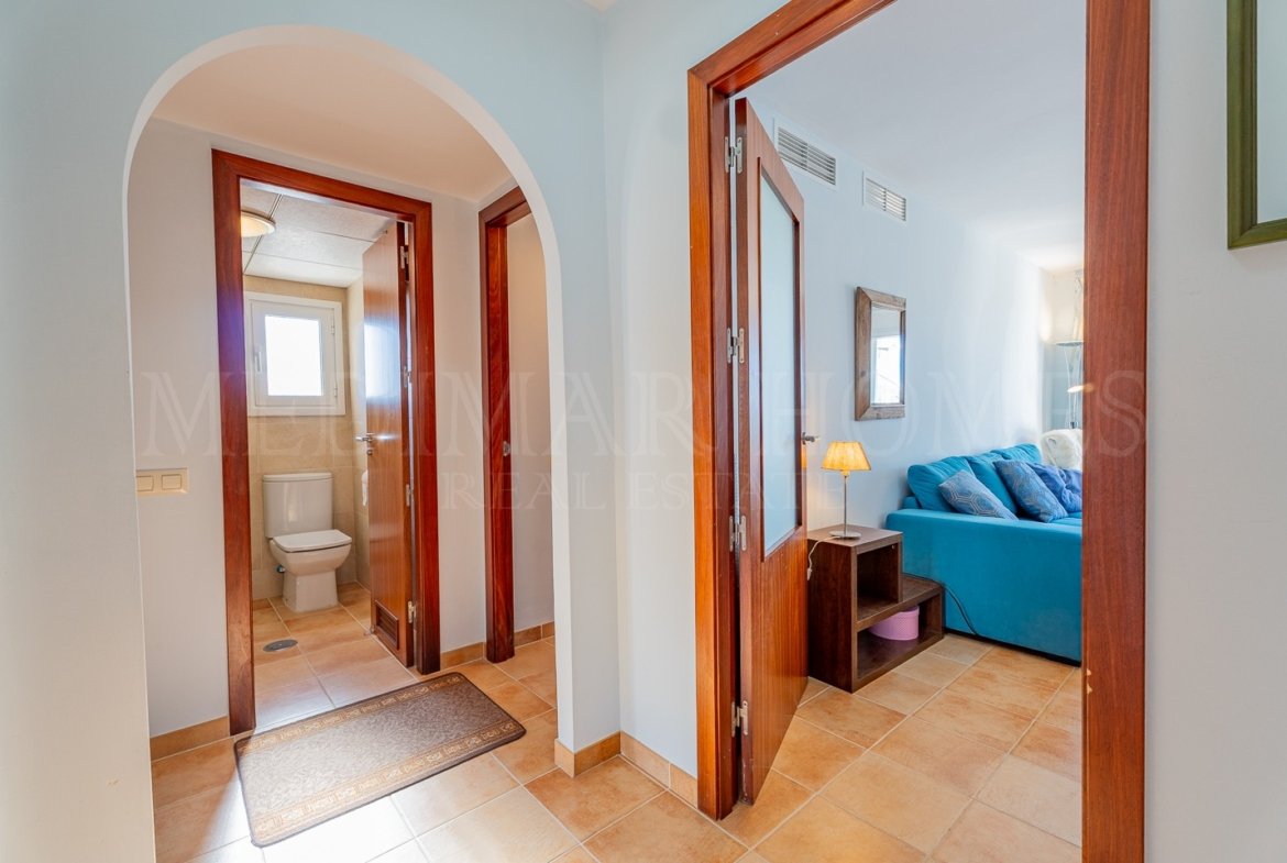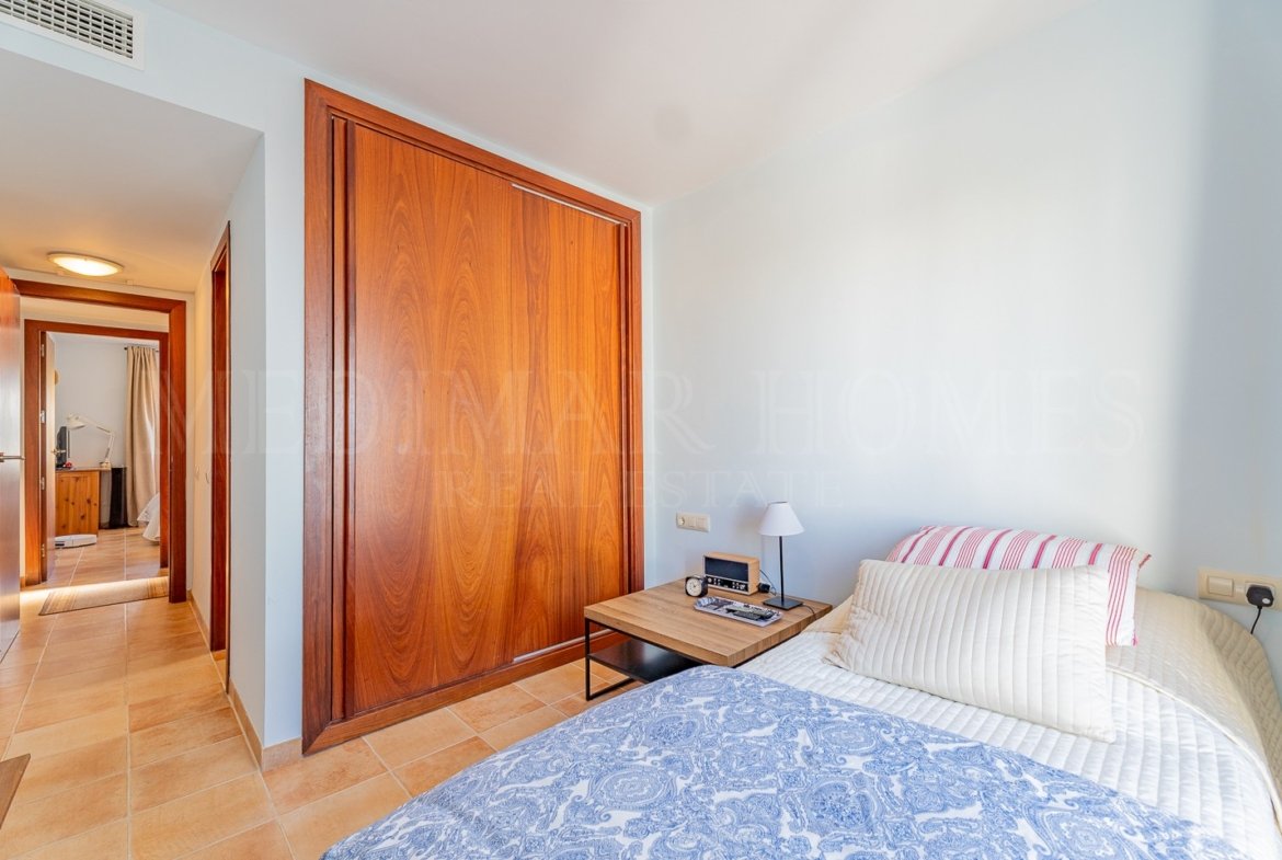 The entrance hall then continues to the sleeping arrangements. To the left is a very comfortable guest double bedroom with fitted wardrobes. Adjacent is the main family shower room featuring a shower cubicle. The hall ends at the master bedroom, which includes fitted wardrobes, access to the same terrace as the living room, and a private en-suite bathroom. A bonus for the apartment is that due to the property’s corner position within the block both bathrooms benefit from windows offering natural light and ventilation.